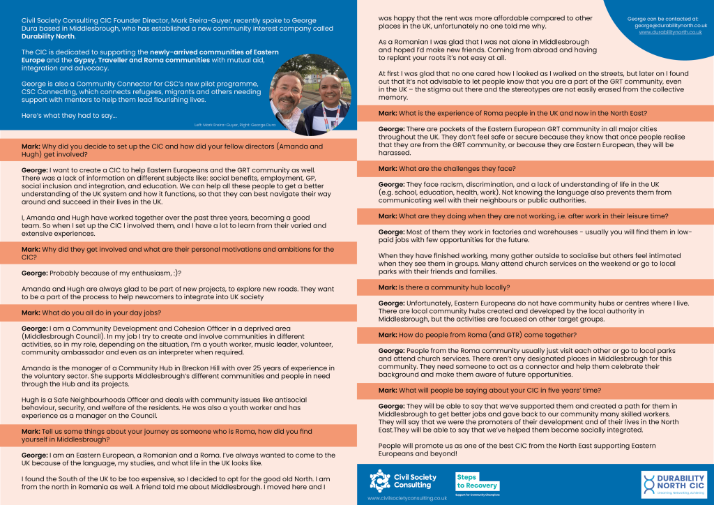 Descoperă parcursul din spatele Asociației De Dezvoltare Rounitară printr-un interviu detaliat cu George Dura, Cofondator și Director. În această conversație, George reflectă asupra începuturilor organizației, asupra experiențelor trăite care i-au modelat misiunea și asupra viziunii pe termen lung privind sprijinirea comunităților est-europene și rome din Nord-Est.